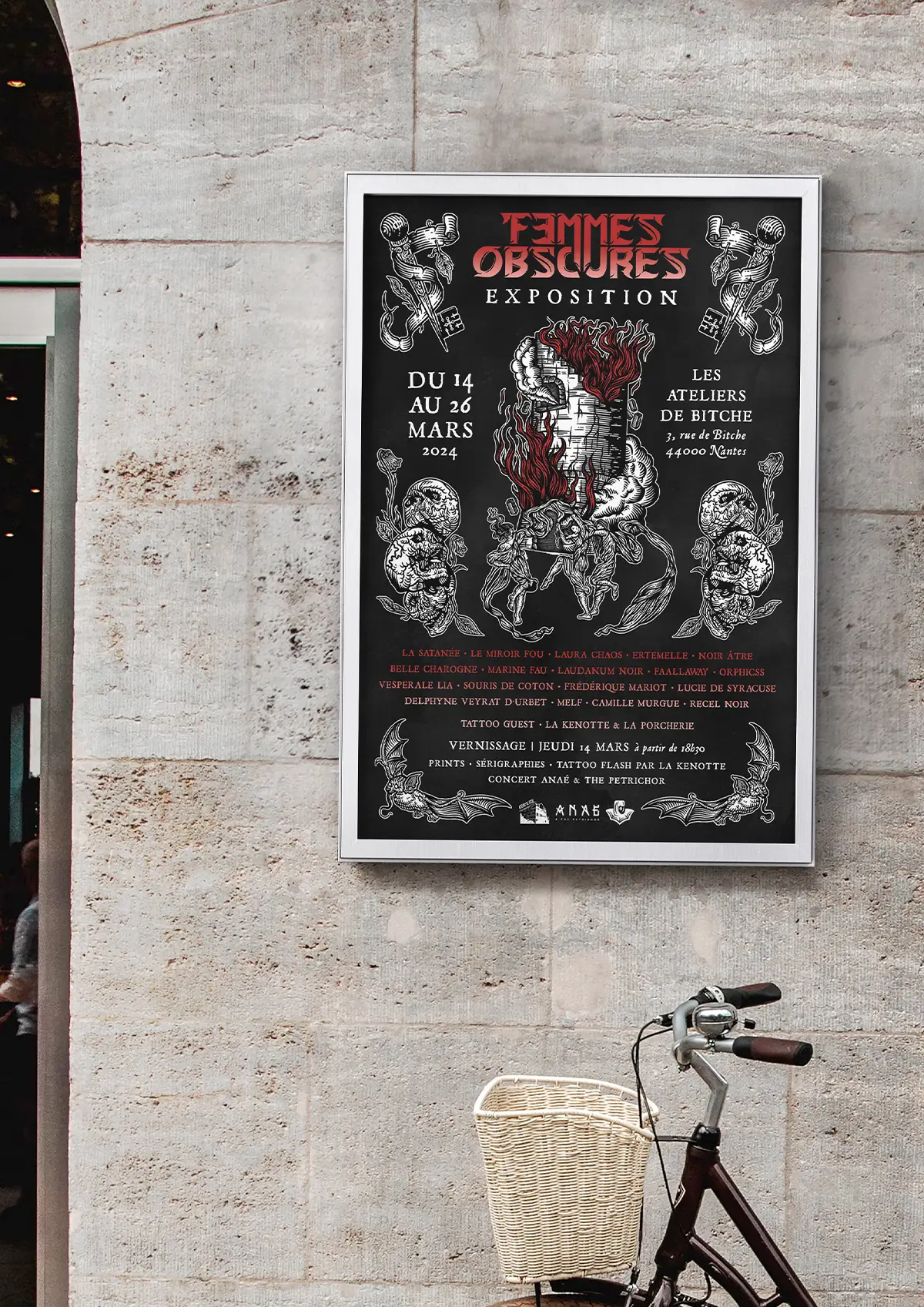 La première édition de l’exposition Femmes Obscures s’est déroulée du 14 au 26 mars 2024 aux Ateliers de Bitche à Nantes et a rassemblé 21 artistes venues de la France entière pour présenter leur travail. Illustration, peinture, céramique, photographie, linogravure, tatouage, performance musicale, l’exposition a su montrer une diversité de médiums et de profils artistiques qui a séduit le public avec plus de 330 visiteurs lors du vernissage et 778 visiteurs sur les deux semaines d’exposition. Le catalogue d’exposition a comptabilisé quant à lui 1015 vues et plus de 200 téléchargements et toutes les artistes de l’exposition ont réalisé des ventes que ce soit d’œuvres originales ou bien de reproductions (prints, sérigraphies, linogravures…) proposées au stand de merch le soir du vernissage.